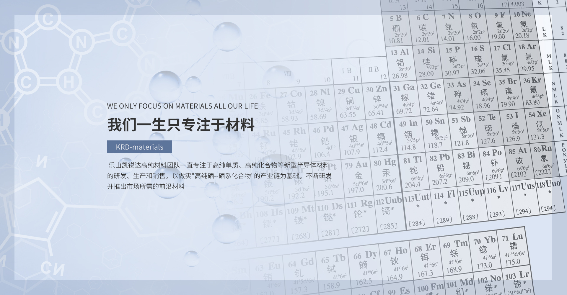 樂山凱銳達(dá)高純材料團(tuán)隊(duì)一直專注于高純單質(zhì)、高純化合物等新型半導(dǎo)體材料的研發(fā)、生產(chǎn)和銷售。以做實(shí)"高純硒--硒系化合物"的產(chǎn)業(yè)鏈為基礎(chǔ),不斷研發(fā)并推出市場(chǎng)所需的前沿材料。專業(yè)人才與技術(shù)方面的優(yōu)勢(shì),為公司的技術(shù)創(chuàng)新、產(chǎn)品開發(fā)和產(chǎn)業(yè)化發(fā)展,打下了堅(jiān)實(shí)的基礎(chǔ)。至今,研制的高純材料多達(dá)300余種,在國(guó)內(nèi)高純領(lǐng)域處于領(lǐng)先地位。
